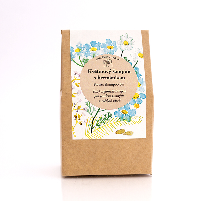 Náš 30g šampon vydrží stejně dlouho jako 200 ml šamponu tekutého. Krásně pění a voní po použitých květinových hydrolátech a esenciálních olejích.