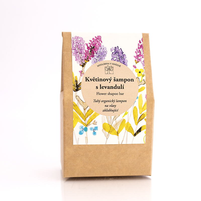 Náš 30g šampon vydrží stejně dlouho jako 200 ml šamponu tekutého. Krásně pění a voní po použitých květinových hydrolátech a esenciálních olejích.